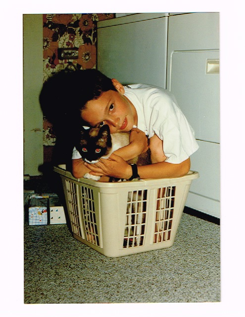 One day Aunt Nene told Julian and I that her neighbor's cat had kittens that needed a home.  We were so excited to go and pick out a kitten.  I remember praying there would be an orange cat, and praying even harder that Julian wouldn't want it!  But he went right for a cute little black and white cat and it was love at first sight.  I got my wish granted too and got to take home an orange striped cat I named Scrappy. Here he is with Zee Zee, another cat they got around the same time.  He loved them both very much, and they loved him.